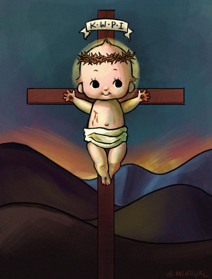 Original piece paying homage to both Ross O'Neill's Kewpies and Svitozar Nenyuk's Jesus Christ On The Cross.